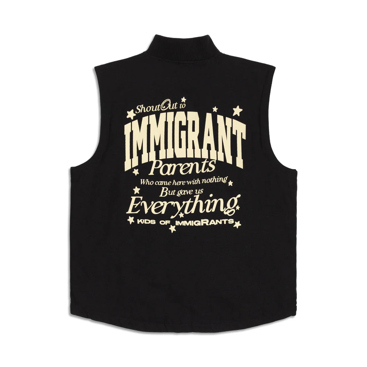 It has an oversized fit, so we recommend sizing down. The vest is finished with hand-sewn details and our Kids Of Immigrants woven label.